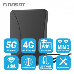 Finnsat FS1300 MIMO-paneeliantennilla saat paremman 5G ja 4G LTE mobiilidatayhteyden kuin pelkällä modeemilla. FS1300 on tarkoitettu sisäkäyttöön. Mukana toimitettavan kiinnikkeen avulla antenni voidaan sijoittaa pöydälle tai asentaa seinälle.